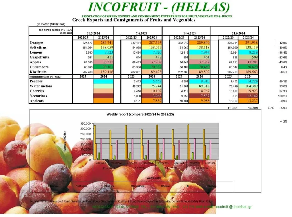 Αυξημένες κατά 6,4% ήταν οι εξαγωγές των αγγουριών, οι οποίες από 1/9/23 έως 21/6/24 ανέρχονται σε 70.620 τόνους έναντι 66.342 τόνων την περίοδο 2022/23.