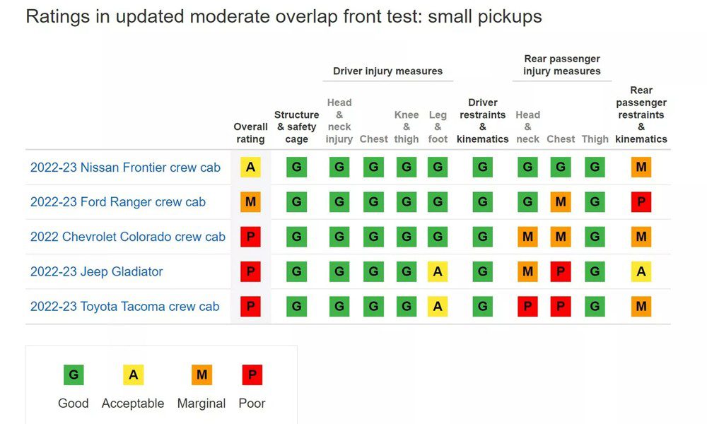 Σε αυτές, την καλύτερη επίδοση συνολικά σημείωσε το Nissan Frontier το οποίο κατετάγη ως «Αποδεκτό», σύμφωνα με τα αυστηρότερα κριτήρια του («IIHS»). Το Ford Ranger χαρακτηρίστηκε ως «Οριακό» και τα υπόλοιπα τρία ως «Ανεπαρκή», πάντα βάσει των καινούργιων δεδομένων (φωτογραφία κάτω).