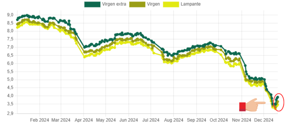 Από τις αρχές Νοεμβρίου οι τιμές παραγωγού απ’ άκρη σ’ άκρη της Μεσογείου, υποχωρούν, κατρακυλούν, με την εξαίρεση της Ιταλίας, η οποία λόγω πολύ μειωμένης παραγωγής μπορεί και κρατάει τα ελαιόλαδα Made in Italy στα επίπεδα άνω των 9,0 ευρώ (τα έξτρα). Στο 109ο τεύχος του «Ελιά & Ελαιόλαδο» υπάρχει μεγαλύτερη ανάλυση.