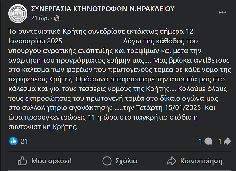 Υπενθυμίζεται ότι αγρότες και κτηνοτρόφοι έχουν προαναγγείλει πανγκρήτια κινητοποίηση για την Τετάρτη 15/1