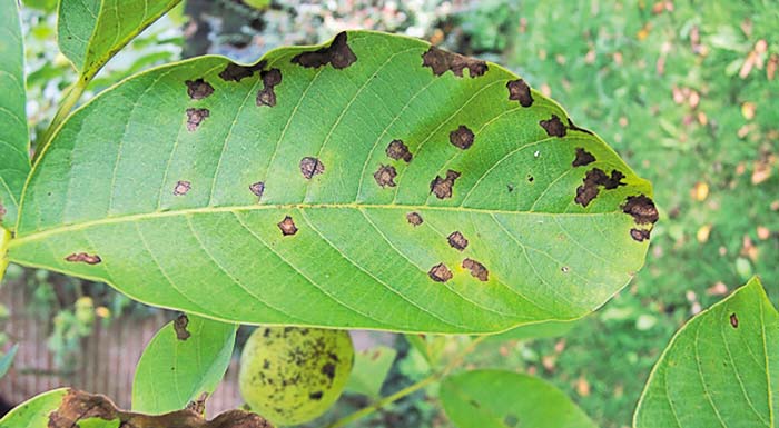 • Ενίοτε εμφανίζονται μικρές νεκρωτικές κηλίδες (1-2 mm) που μπορούν να συνενωθούν, προκαλώντας φυλλόπτωση (από τον Ιούλιο και μετά).
