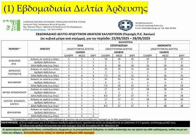 Σε συνεργασία με την Περιφέρεια Κρήτης, από το 2018 ως και σήμερα, κατά την διάρκεια της εκάστοτε αρδευτικής περιόδου, εκδίδονται σε εβδομαδιαία βάση από τον ΕΛΓΟ – ΔΗΜΗΤΡΑ / Ινστιτούτο Ελιάς Υποτροπικών Φυτών & Αμπέλου στα Χανιά, δελτία άρδευσης για 20 αγροτικές περιοχές σε όλη την Κρήτη. Τα δελτία ενημερώνουν τους παραγωγούς για το πόσο νερό χρειάζεται κάθε καλλιέργεια, ανάλογα με τις καιρικές συνθήκες, το στάδιο ανάπτυξης του φυτού και τον τύπο του εδάφους.