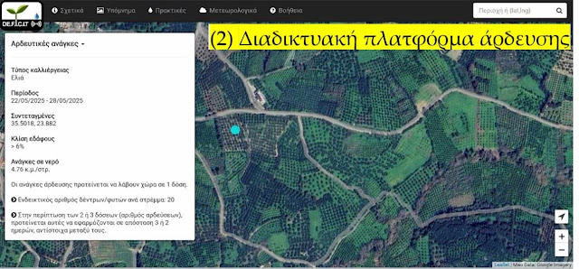 Για τους πιο εξοικειωμένους με τις νέες τεχνολογίες, υπάρχει η πρωτοποριακή ελεύθερης πρόσβασης ψηφιακή πλατφόρμα DEFICIT (www.irrigation-crete.gr), ένα εργαλείο που λειτουργεί σαν «έξυπνος υπολογιστής άρδευσης για κάθε αγροτεμάχιο σε όλη την Κρήτη»: