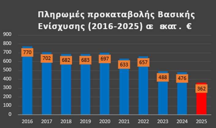Σύμφωνα με το εγκεκριμένο Στρατηγικό Σχέδιο της Κοινής Αγροτικής Πολιτικής (Σ.Σ. ΚΑΠ), το ποσό της Βασικής Ενίσχυσης για το 2025 ανέρχεται σε €829.567.104 Η χώρα μας είχε τη δυνατότητα να καταβάλει ως προκαταβολή το 70% του ποσού, δηλαδή €580.696.972.