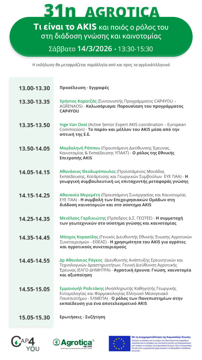 Η διάχυση της γνώσης και η εφαρμογή καινοτόμων πρακτικών αποτελούν πλέον μονόδρομο για την επιβίωση και την ανάπτυξη του σύγχρονου αγροτικού τομέα. Σε αυτό το πλαίσιο, η κορυφαία εκδήλωση του προγράμματος #CAP4YOU, η οποία θα διεξαχθεί στη φετινή 31η #AGROTICA, έρχεται να ρίξει φως σε ένα σύστημα κομβικής σημασίας: το σύστημα #AKIS.
